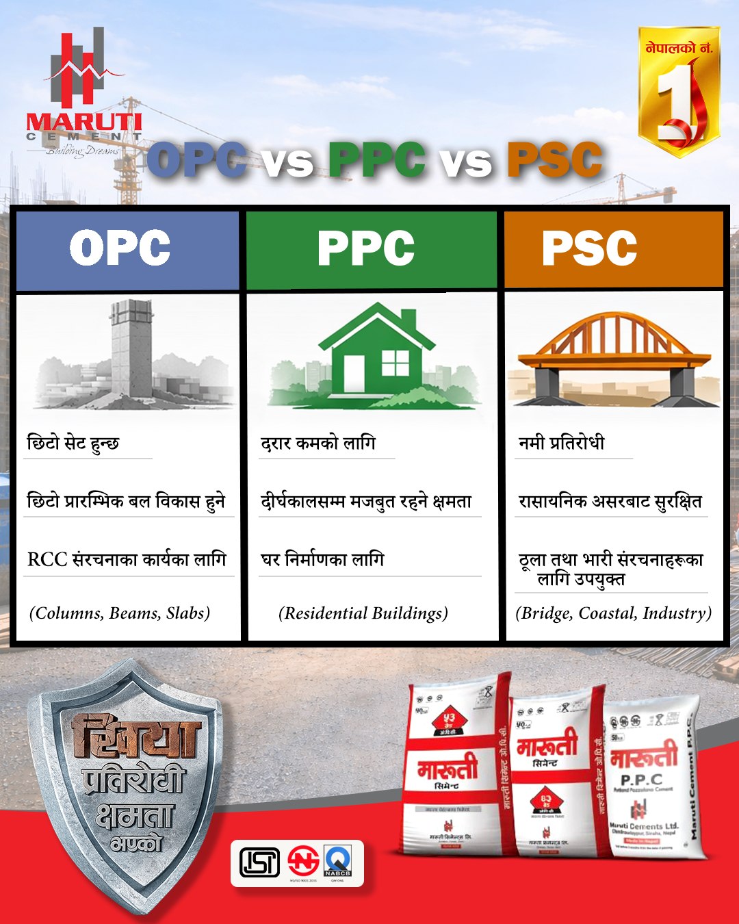 OPC, PPC र PSC काम अनुसार सही सिमेन्ट छान्नु नै दिगो र मजबुत निर्माणको आधार हो। Maruti Cement सँग पाउनुहोस् भरपर्दो गुणस्तर, मजबुती र दीर्घकालीन सुरक्षा। |
